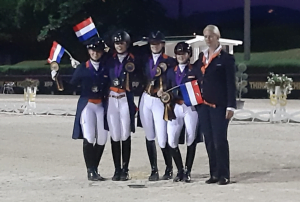 Zonder streepresultaat vanwege het uitvallen gisteren van Jasmien de Koeyer heeft de Nederlandse U25-ploeg in Italië met de zilveren medaille een prachtig resultaat behaald. Jeanine Nieuwenhuis won met TC Athene zelfs de proef met 76.324%. Op de foto wordt Jeanine gehuldigd in het team als de winnares. Denise Nekeman reed naar de vierde plaats met Boston STH met 73.882% en Carlijn Huberts maakte het met Watoeshi af met een achtste plaats en 70.176%.
