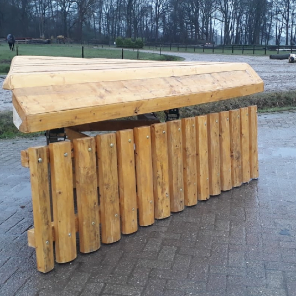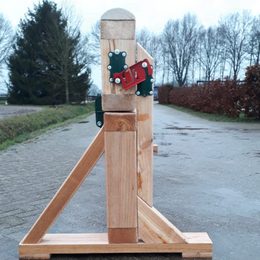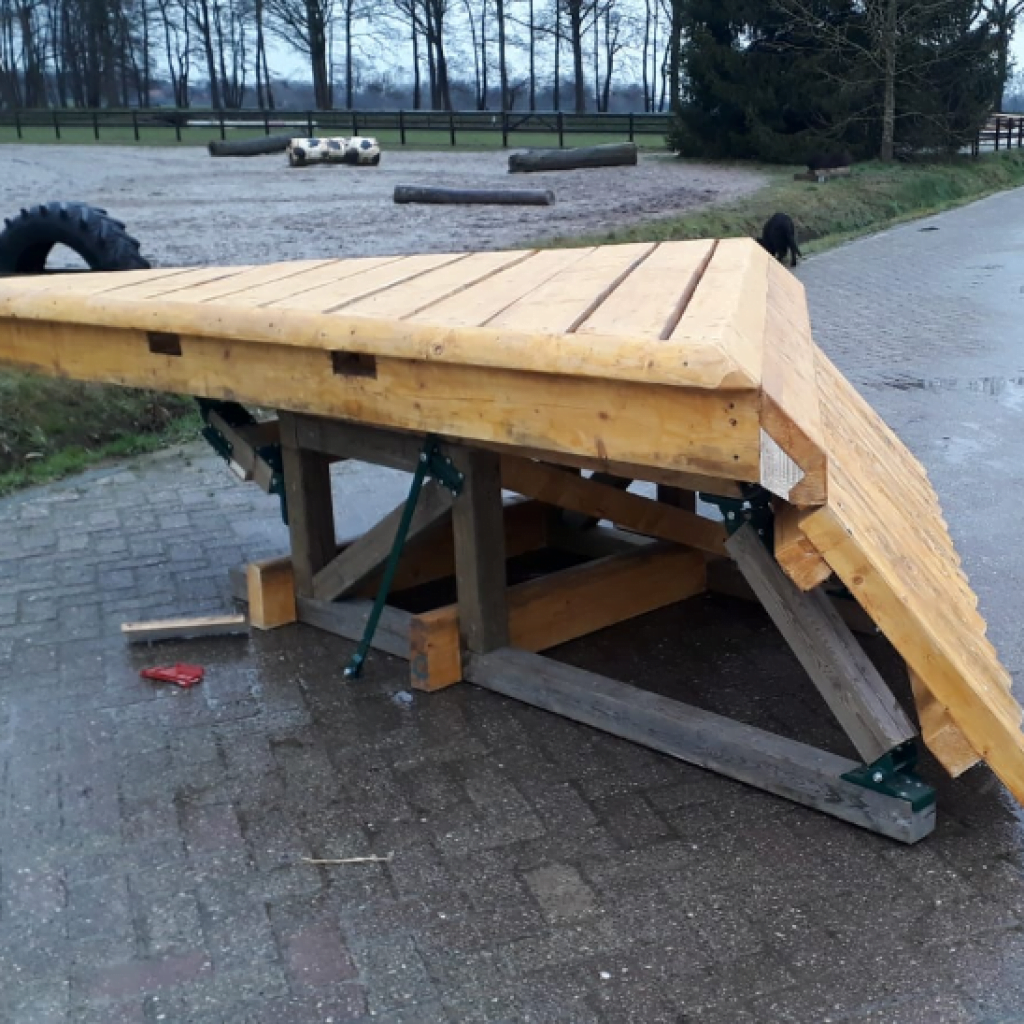 Gert heeft dit systeem nu ook toegepast op verschillende hindernistypen. ‘’ Soms was dat best even rekenen en nadenken om alles te laten scharnieren. Zeker als we het over de punt hebben, daar zaten namelijk nogal verschillende schuintes in. Best even puzzelen maar in mijn hoofd moest het kunnen en dat is uiteindelijk ook gelukt!’’ aldus Gert. Hij vond het vooral belangrijk dat de voorzijde van de hindernis dicht is op het moment dat deze is geactiveerd, zodat wanneer er een paard op ligt deze niet ergens klem kan komen te zitten bij het overeind komen.